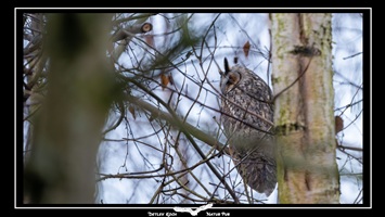 Waldohreule (Asio Otus) - Freisitzend und bei besserem Wetter im Ruhebaum